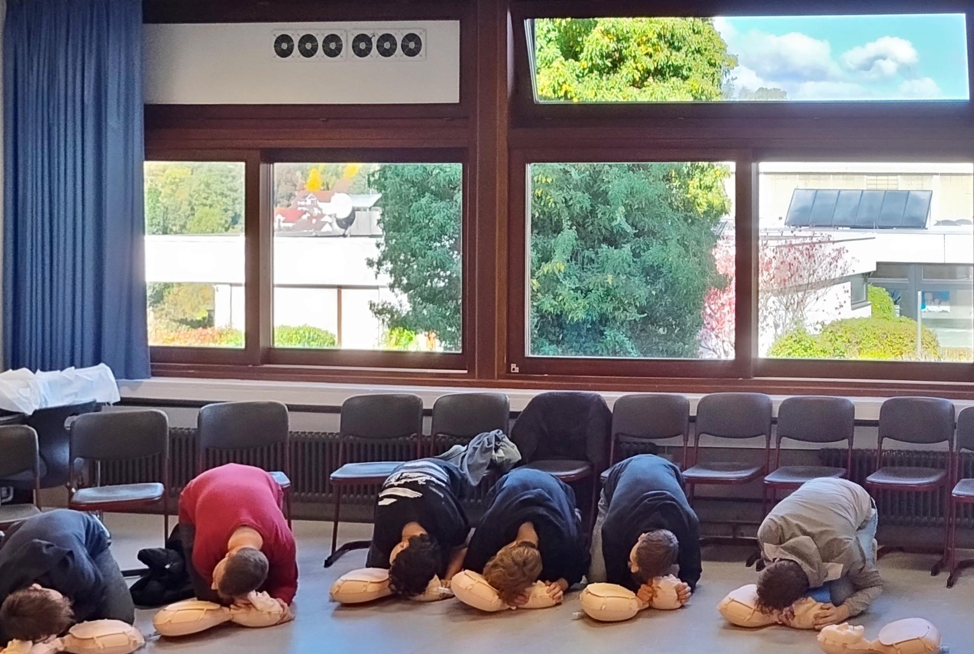 Im Rahmen der bundesweiten „Woche der Wiederbelebung“ besuchte am 14. 10 und 15.10 das Team von Frau Dr. Kandhari und Herr Fischle vom Alb-Fils-Klinikum Göppingen gemeinsam mit Frau Steinbacher vom Deutschen Roten Kreuz die Schurwaldschule in Rechberghausen – und verwandelte ein Klassenzimmer kurzerhand in ein echtes Notfalltraining. Organisiert wurde diese Veranstaltung von Brigitte Schmid.